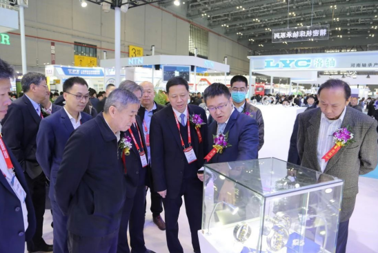 ▲中国轴承工业协会理事长周宇一行参观建龙哈轴展位,建龙哈轴常务副总经理滕锴为其介绍产品